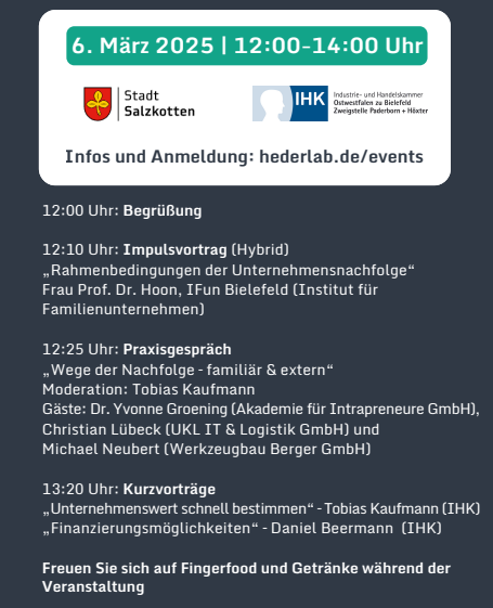 Um Sie bei diesem wichtigen Schritt zu unterstützen, laden wir – die IHK Ostwestfalen, die Wirtschaftsförderung der Stadt Salzkotten und das heder:LAB – Sie herzlich zu unserer kostenfreien Informationsveranstaltung ein. Freuen Sie sich auf wertvolle Anregungen.